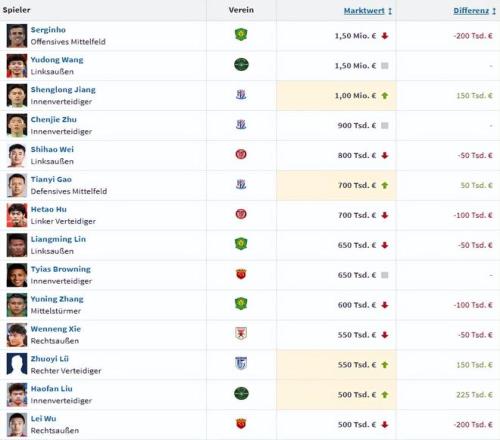 北京国安的古加从350万欧降到了280万欧,排名第五。青岛西海岸的里切利、深圳新鹏城的韦斯利、天津津门虎的哈达斯同为200万欧,并列第六。云南玉昆的布尔克、青岛西海岸的阿齐兹、成都蓉城的古尔芬克尔和罗慕洛四人同为180万欧,并列第九。