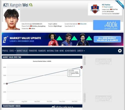 值得关注的是,上赛季效力梅州客家的小将魏祥鑫身价从20万欧元翻倍来到40万欧元,这名17岁的前锋球员将在明夏加盟法国欧塞尔足球俱乐部。