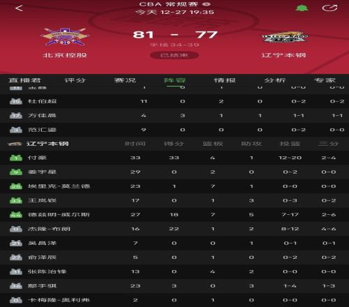 北京时间今日,在CBA常规赛中,辽宁本钢在客场以77-81不敌北京控股。