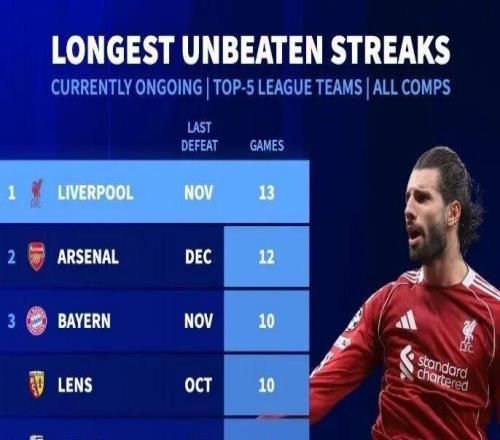 德转丨五大联赛球队目前不败场次榜 -